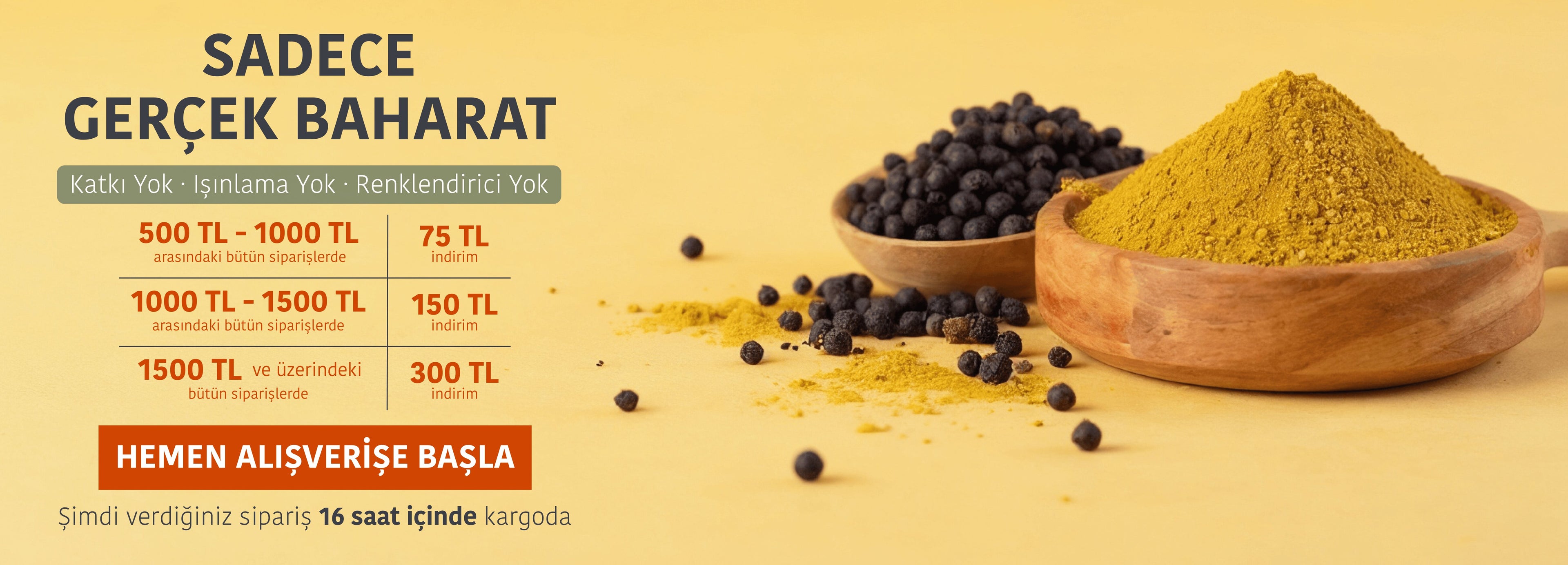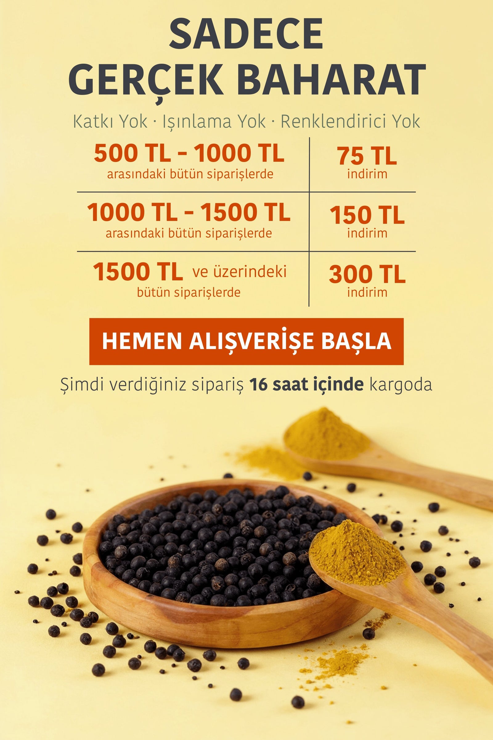 Baharatta tazelik ve kalite bizim için çok önemli. Yaşadığınız bir problemde bizimle iletişime geçmeniz yeterli — hatalı, hasarlı ya da yanlış gönderimlerde hızlıca çözüm sağlarız. Açılmış baharatlarda hijyen sebebiyle iade yapılamaz.